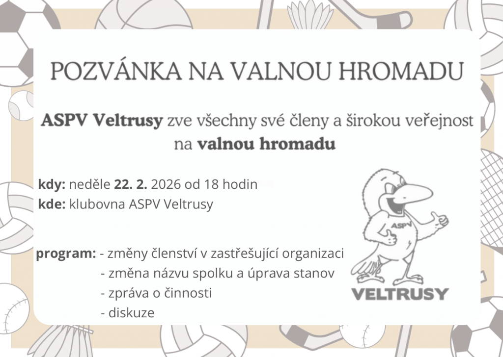 Zveme všechny své členy a příznivce v sobotu 6. 12. od 15:00 do naší klubovny (Palackého 450, Veltrusy – vchod z Tyršovy ulice) na valnou hromadu ASPV Veltrusy.