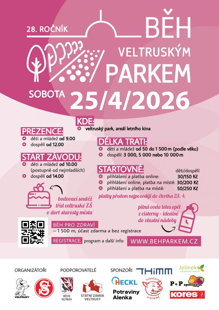 Letošní 28 ročník Běhu veltruským parkem se uskuteční v už sobotu 25. dubna 2026. Online registrace na závod jsou spuštěny, všechny aktuální informace k běhu naleznete na webu závodu.